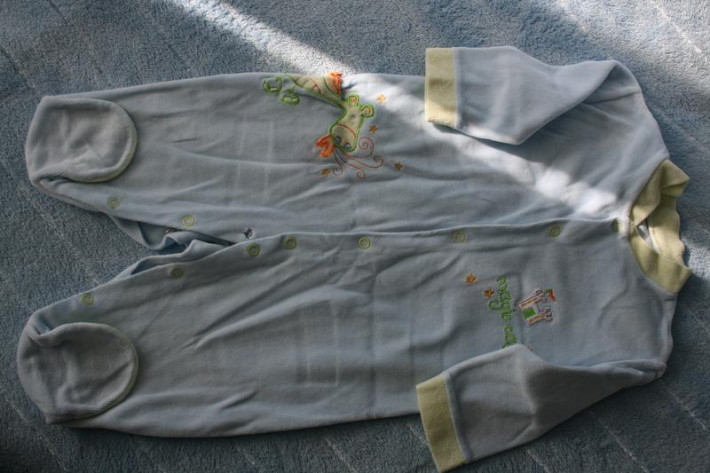 6. Комплект PlayToday р.68/74, спуск петелек около шва, где пришита ступня к штанине, 300 руб.