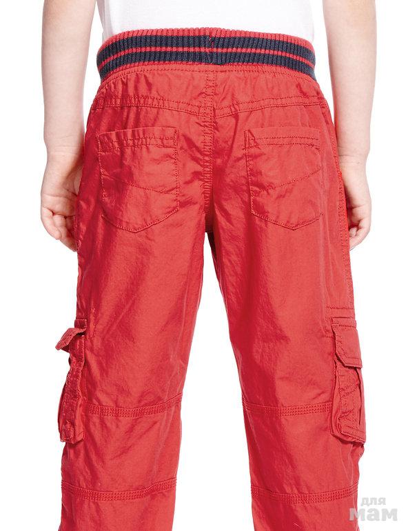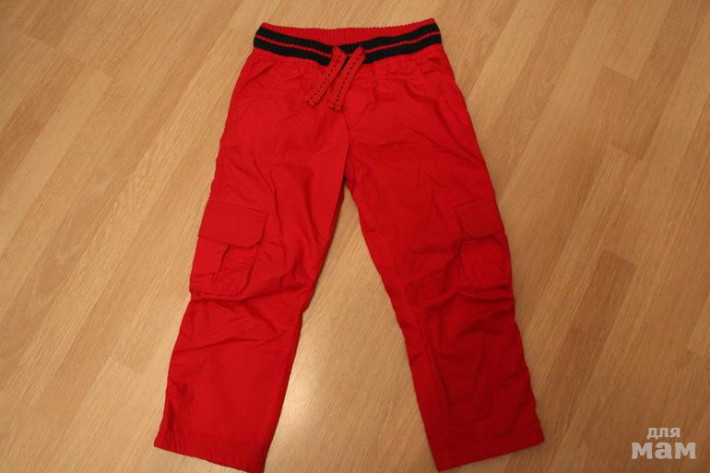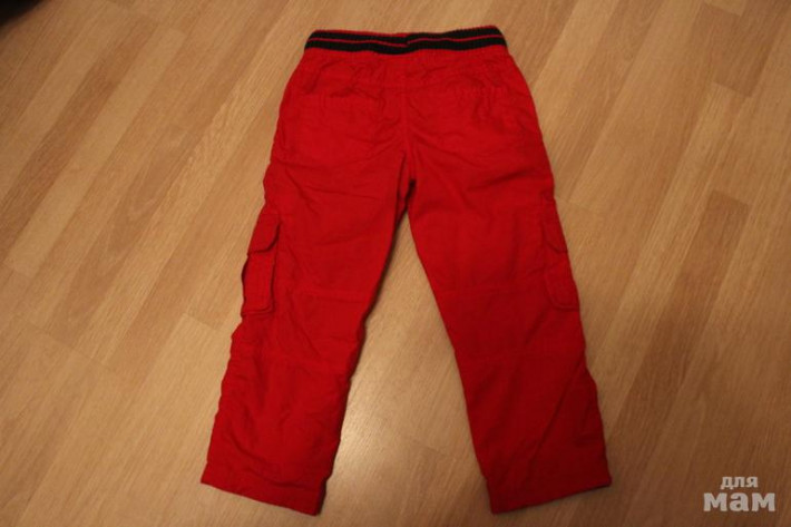 Брючки хлопковые фирмы Marks&Spenser. Ткань хлопок летний, на трикотажной подкладке внутри, красные, в жизни ткань без блеска, 2 кармана по бокам, 2 сзади + накладные карманы на штанинах, трикотажный пояс, есть шнурок-утяжка по кругу. Состав 100% хлопок, 2-3г (92-98), 3-4г (98-104) 550руб
