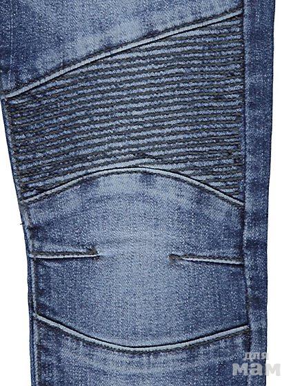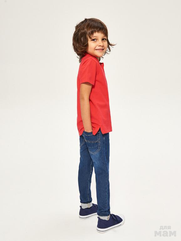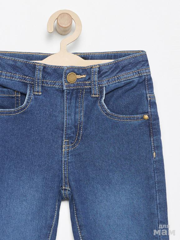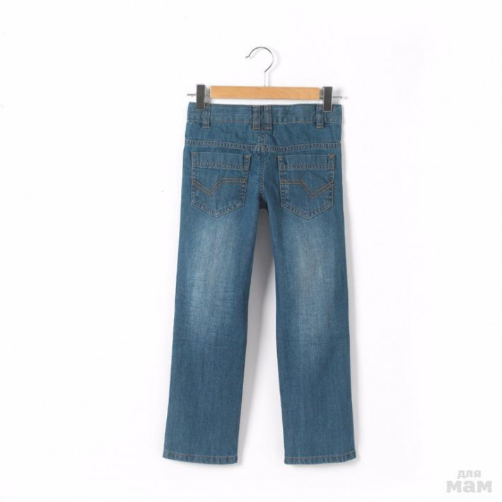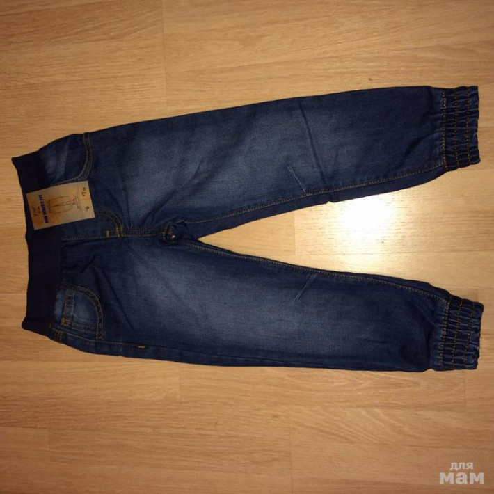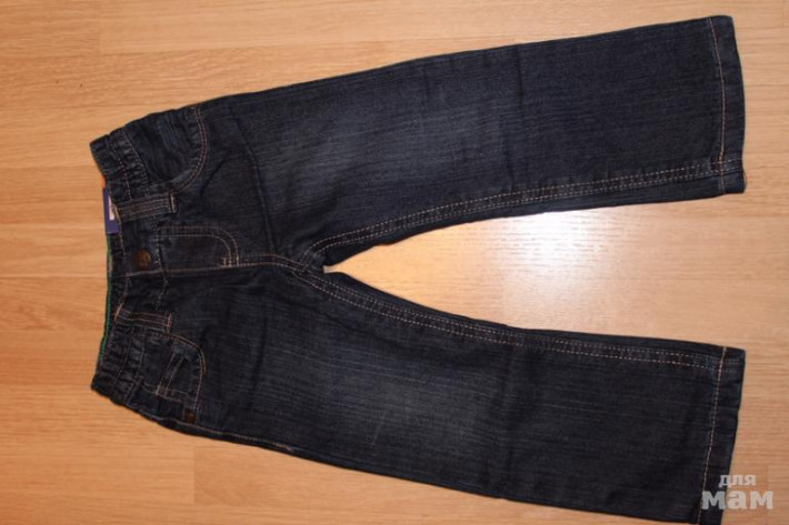 Джинсы прямые на трикотажной подкладке фирмы Lupilu. В поясе резинка, без застежки, без регулировки в поясе, 2 кармана по бокам, 2 сзади. Темно-синие с коричневой отстрочкой и синие с зеленой отстрочкой. Состав 65% хлопок, 35% полиэстер.