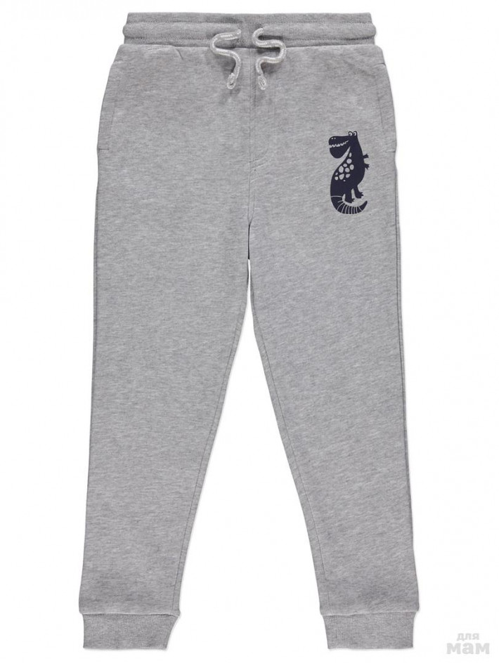 Брюки спортивные фирмы George. Серые, внутри с начесом, внизу штанины на манжете, по бокам 2 кармана, шнурок-утяжка по кругу в поясе. На брючине рисунок Динозаврик. Состав 80% хлопок, 20% полиэстер.