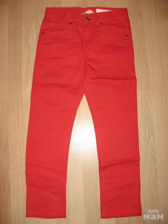 Брюки (цветные джинсы) фирмы H&M. Хлопковая ткань ярко-красного цвета , 3 кармана впереди, 2 сзади, застежка пуговица+молния, внутри резинка-утяжка по кругу. Состав 100% хлопок. Размер 5-6л (110-116), 690руб