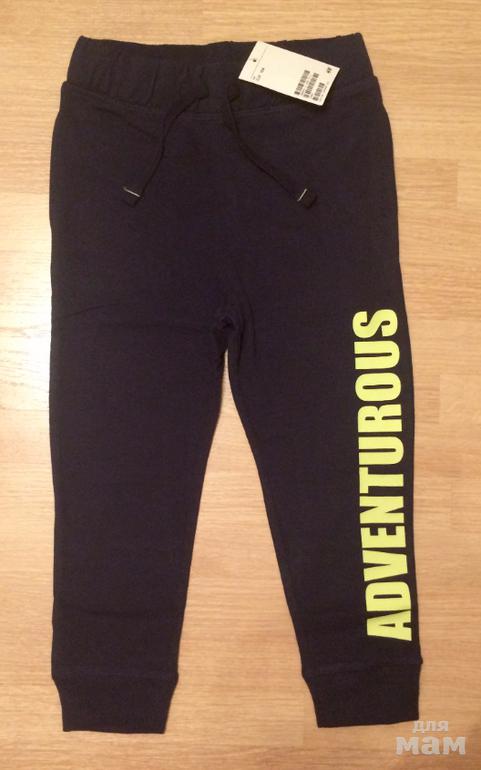 Брючки спортивные фирмы H&M. Темно-синие, трикотаж без начеса, резинка по низу штанин, 2 кармашка по бокам, в поясе шнурок- утяжка по кругу, яркая надпись на штанине . Состав 100% хлопок.