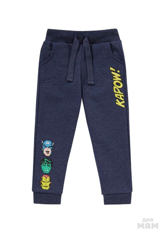 Брючки спортивные фирмы F&F. Синие, внутри с начесом, внизу штанины на резинке, 2 кармана по бокам, утяжка-шнурок в поясе. Впереди надпись на штанине "Класс!", внизу на штанине рисунки героев Железный человек, Капитан Америка и Халк. Состав 47% хлопок, 53% полиэстер.