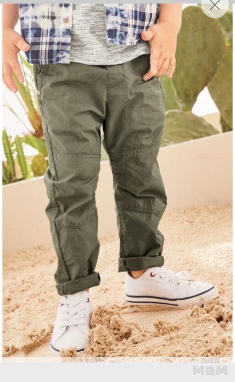 Брюки летние цвета хаки фирмы NEXT. Хлопковая ткань, 2 кармана впереди, 2 кармана сзади, пояс - резинка, впереди завязка-шнурок, подворотики на штанинах. Состав 100% хлопок.