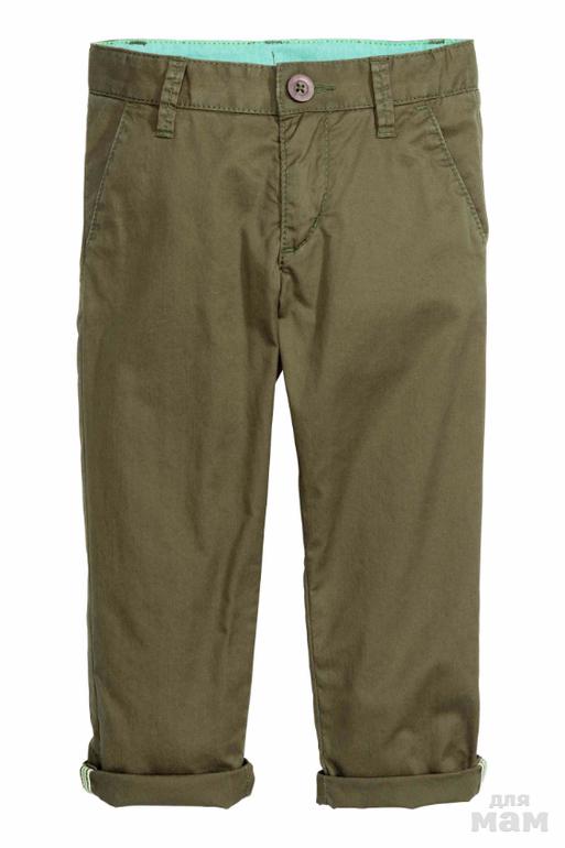 Брючки-чиносы летний хлопок фирмы H&M. Цвет хаки, 2 кармана впереди, 1 сзади на пуговице, утяжка-резинка в поясе. Состав 100% хлопок.