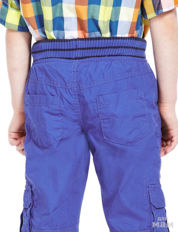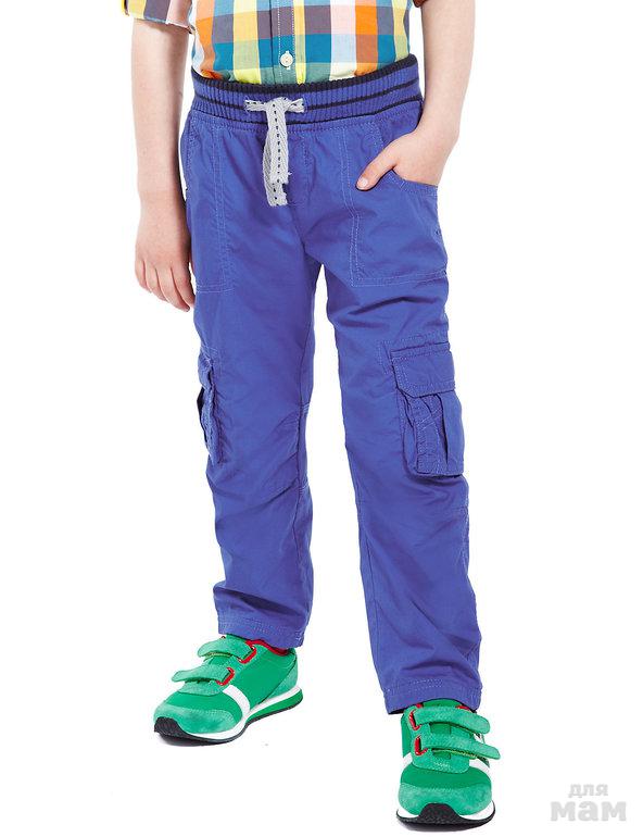 Брючки хлопковые фирмы Marks&Spenser. Ткань хлопок летний, на трикотажной подкладке внутри, синие, 2 кармана по бокам, 2 сзади + накладные карманы на штанинах, трикотажный пояс, есть шнурок-утяжка по кругу. Состав 100% хлопок,
