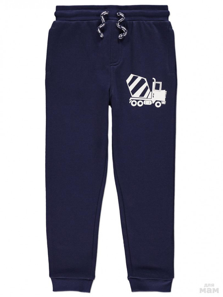 Брюки спортивные фирмы George. Темно-синие, внутри с начесом, внизу штанины на манжете, по бокам 2 кармана, шнурок-утяжка по кругу в поясе. На брючине рисунок машина. Состав 80% хлопок, 20% полиэстер.