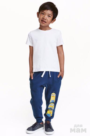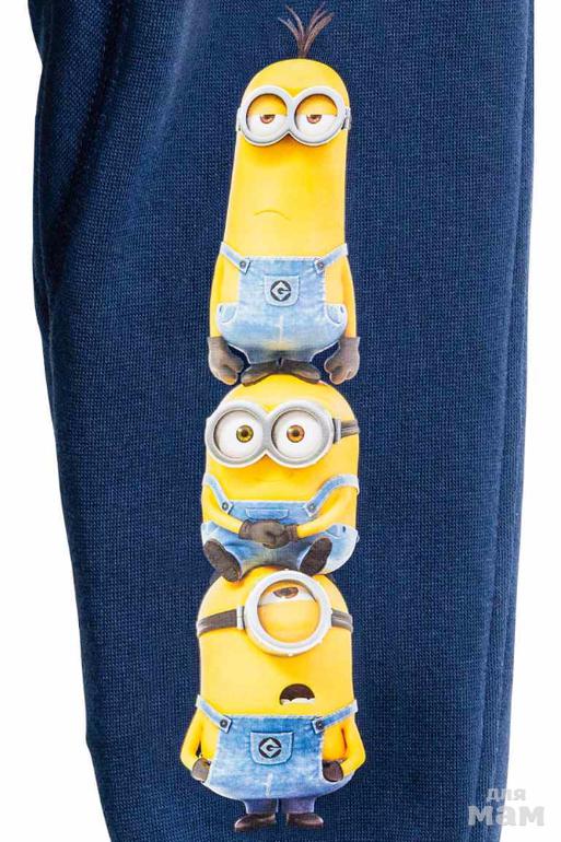 Брючки спортивные фирмы Н&М. Темно-синие, с начесом, манжет по низу штанин, 2 кармана по бокам, в поясе шнурок- утяжка по кругу, яркий рисунок Миньоны на штанине. Состав 100% хлопок,