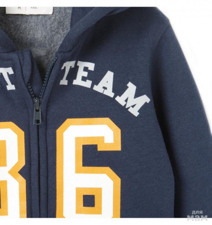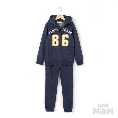Спортивный костюм фирмы La Redoute. Синий, внутри с начесом. Кофта с капюшоном, застежка молния, впереди принт цифры , карман-кенгуру. Брюки с эластичным поясом, 2 кармана по бокам, низ брючин на резинке. Состав 60% хлопок, 40% полиэстер.