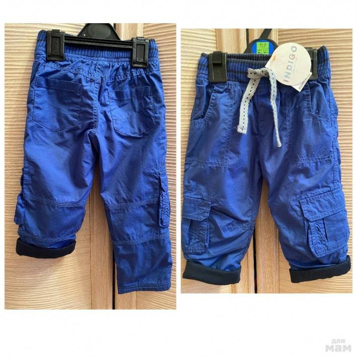 Джинсы прямые на трикотажной подкладке фирмы Lupilu. В поясе резинка, без застежки, без регулировки в поясе, 2 кармана по бокам, 2 сзади. Темно-синие с коричневой отстрочкой и синие с зеленой отстрочкой. Состав 65% хлопок, 35% полиэстер. Размер 2г (92), 590руб
