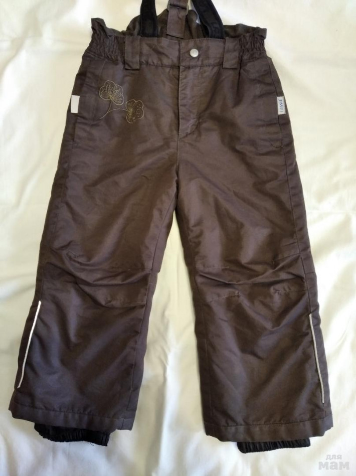 зимние брючки с лямками, попа и коленки в норме, на краях штанин видны следы носки. Шаговый шов 38см, цвет серо-коричневый.