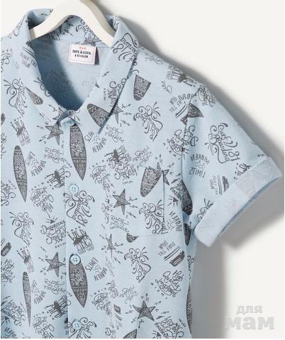 Рубашка ТРИКОТАЖНАЯ с коротким рукавом фирмы t-a-o (Tape à l'oeil) Франция. Бледно-голубая, рисунки и надписи, кармашек на груди. Состав 100% хлопок.
