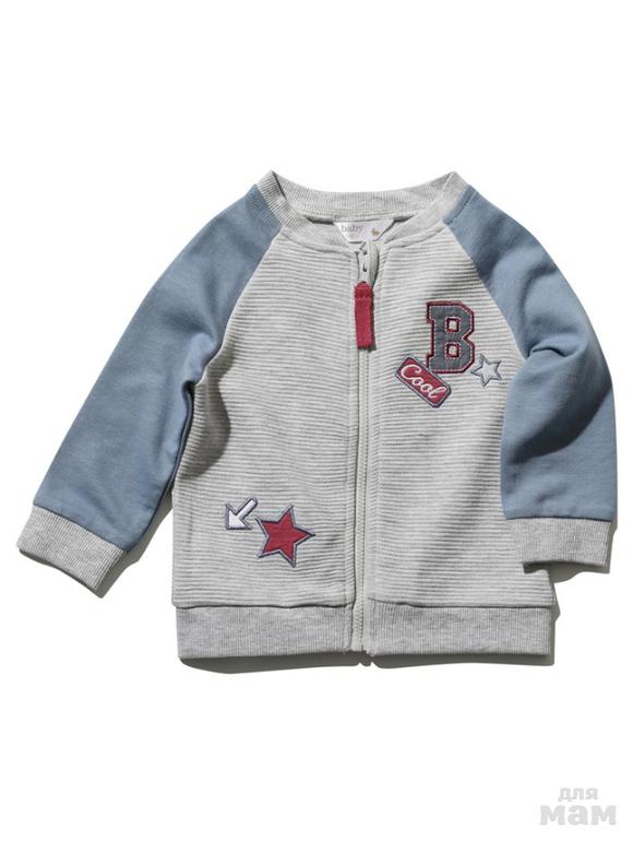Кофточка на молнии с длинным рукавом фирмы M&Co. Серая с голубыми рукавами, впереди нашивки, застеэка молния. Плотный трикотаж без начеса. Состав 100% хлопок,
