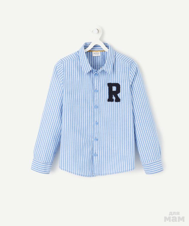 Рубашка с длинным рукавом фирмы t-a-o (Tape à l'oeil) Франция.Голубая-белая полоска, на рукавах бежевая отделка, на груди буква объемная R из ниток. Состав 100% хлопок. Размеры 8л (128), 750руб.