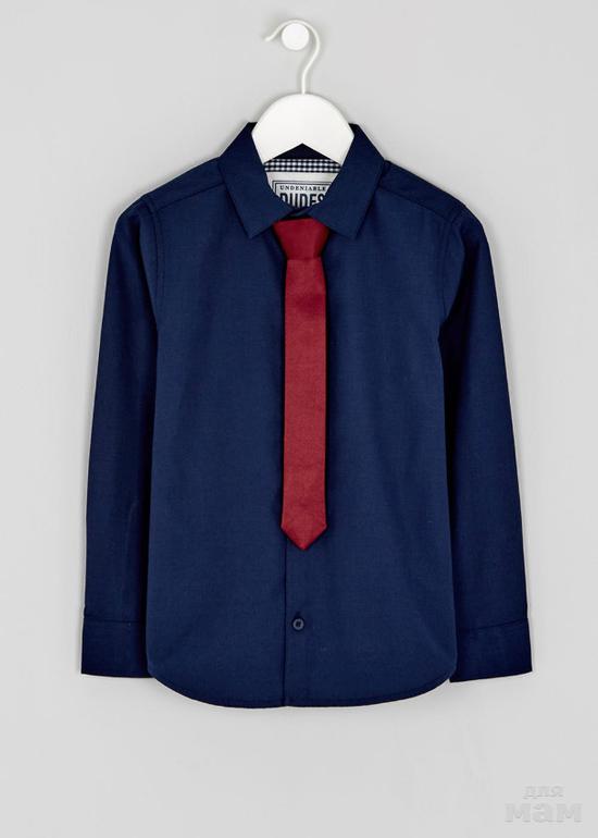 Рубашка с длинным рукавом и галстуком фирмы Matalan. Темно-синяя, в комплекте с красным галстуком - застегивается на липучку . Состав 22% хлопок, 78% полиэстер. Отличное качество, почти не мнется.