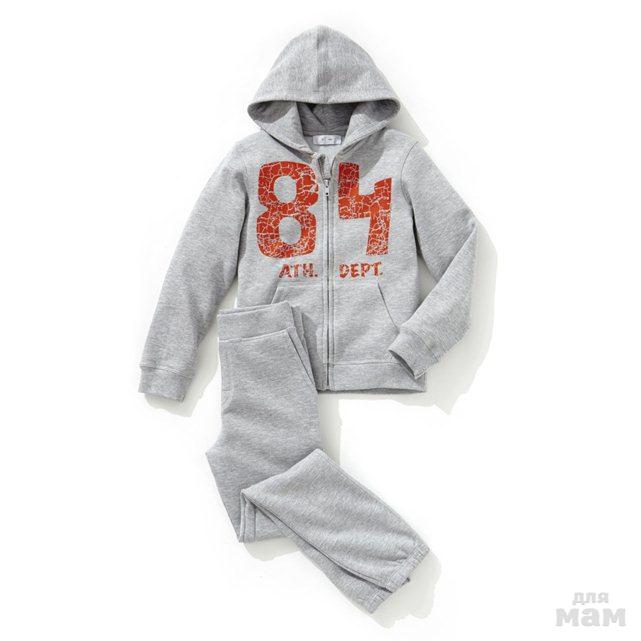 Спортивный костюм фирмы La Redoute. Серый, внутри с начесом. Кофта с капюшоном, застежка молния, впереди принт цифры , карман-кенгуру. Брюки с эластичным поясом, 2 кармана по бокам, низ брючин на резинке. Состав 60% хлопок, 40% полиэстер.