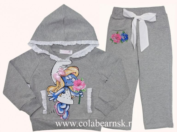 Джемпер с капюшоном и карманами, декорированными ажурной тесьмой. Принт также декорирован тесьмой, стразами и бантиком. Брюки прямого кроя с тесьмой на поясе. В верхней части модели цветочный принт. 95% хлопок, 5% лайкра.