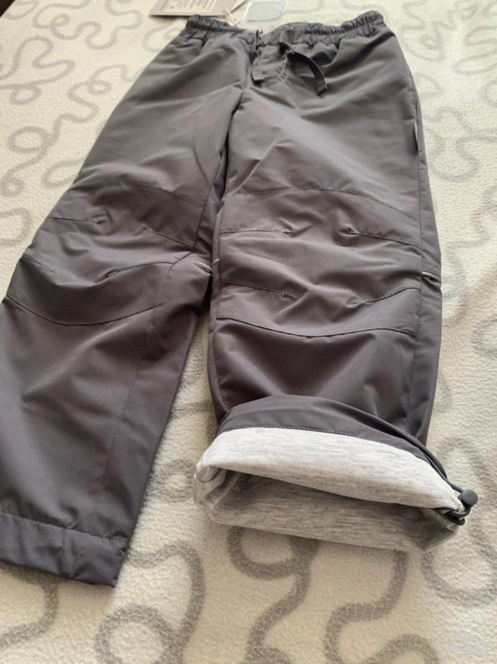 Мембранная ткань, подкладка из хлопка, светоотражатель. Ширину штанины внизу можно регулировать.