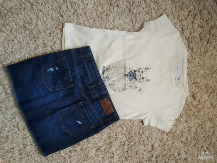 все новое, но без бирок планировали носить сами. юбка с утяжкой 134 размер и футболка с блестящим котиком 122 (большемерит) комплект соразмерный, практически по цене одной юбки.