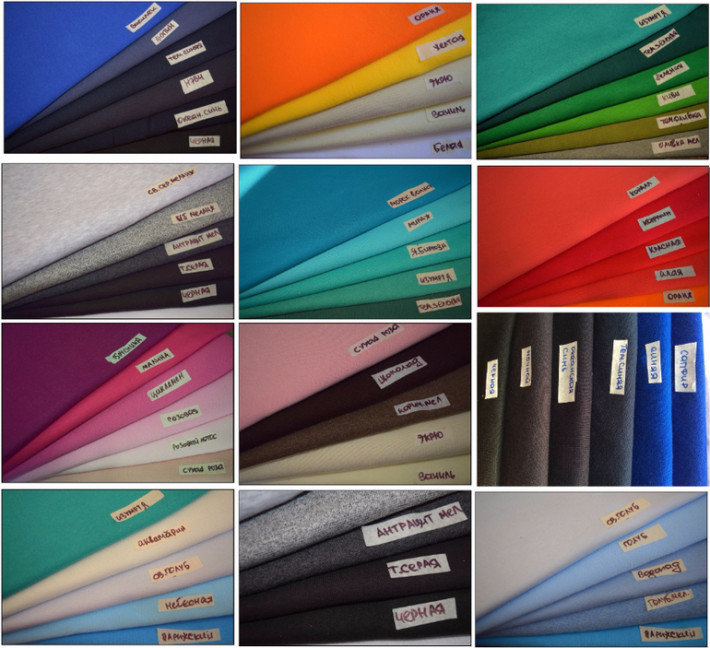 Летний трикотаж - пудра, капучино, кофе, светлый хаки, яркий хаки, изумруд и много других цветов. Такие же есть на осень-весну.