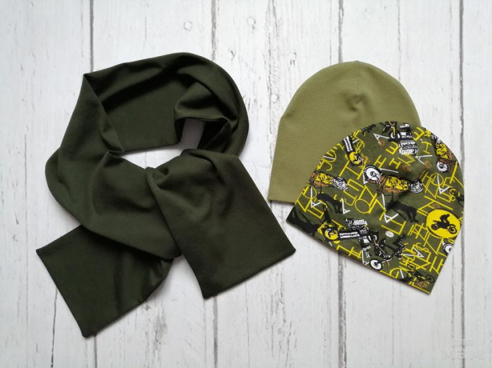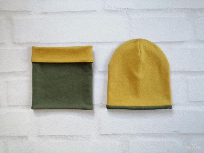 Хаки + горчица.   Шапочка и снуд двусторонние