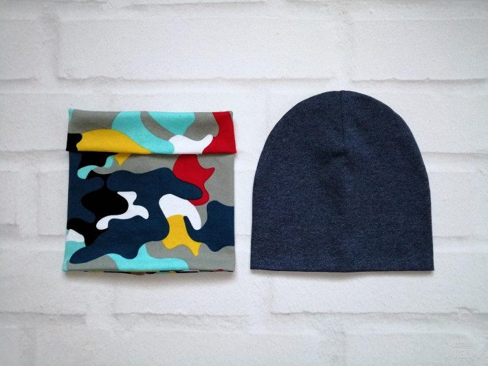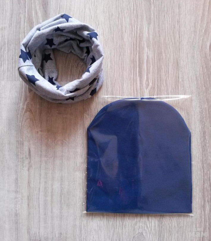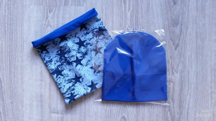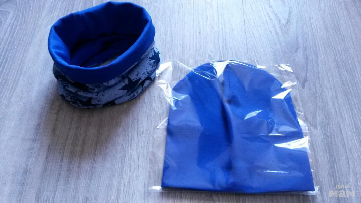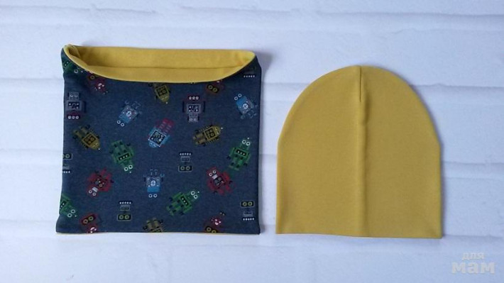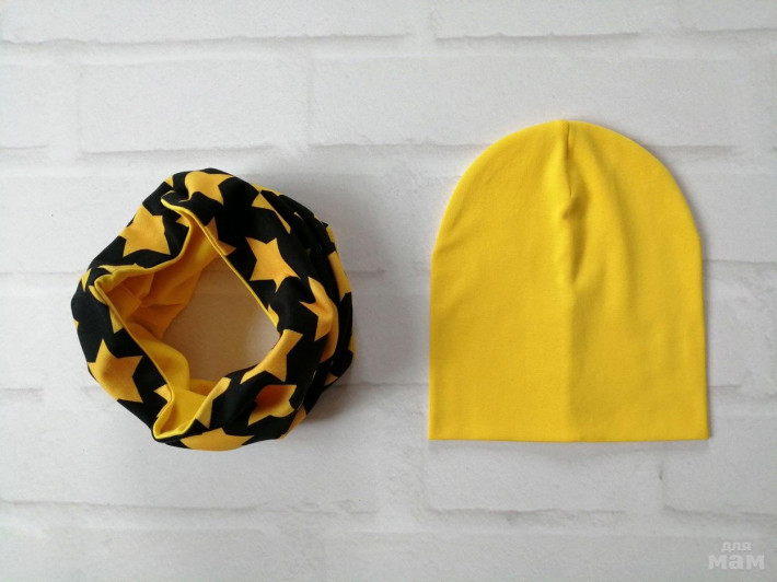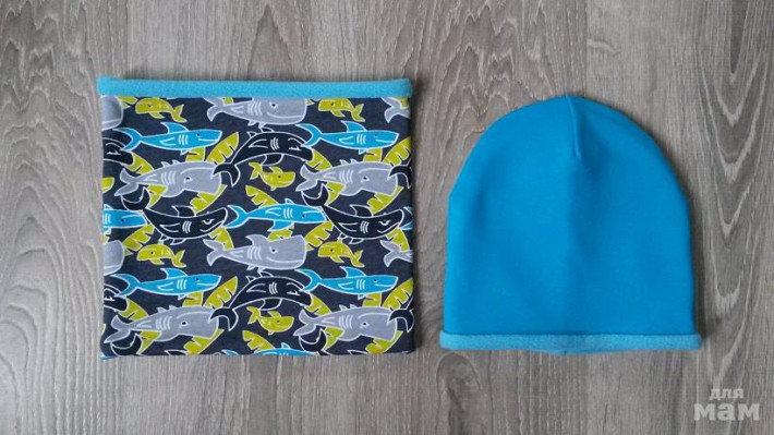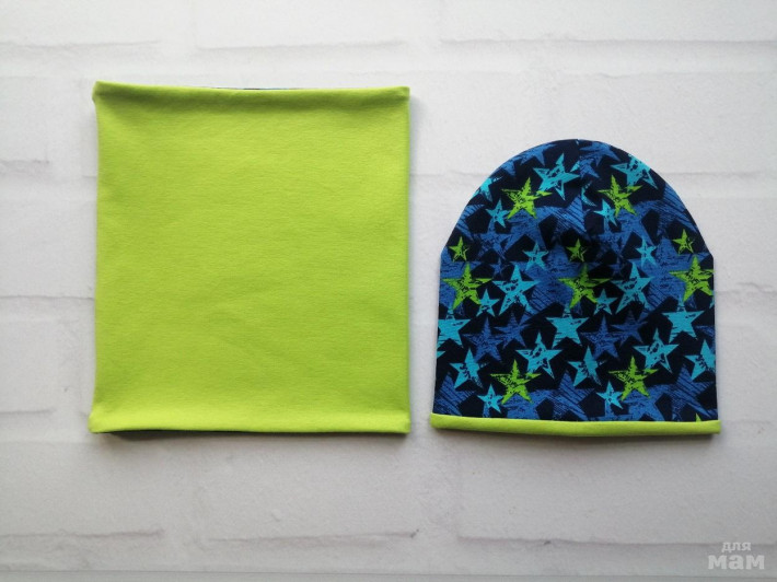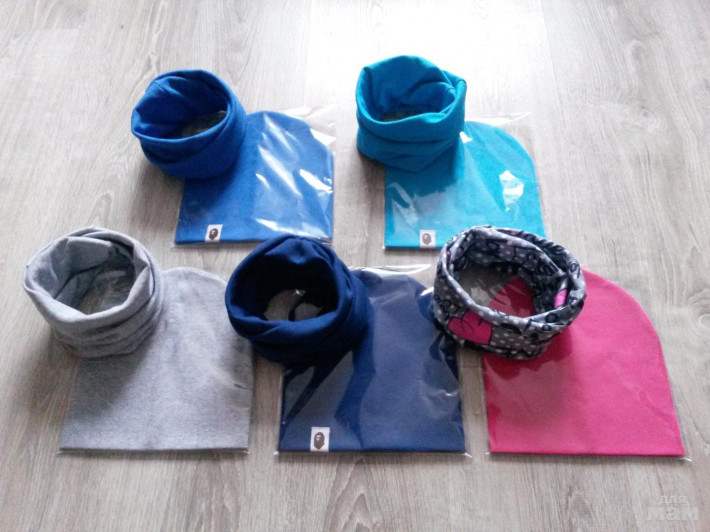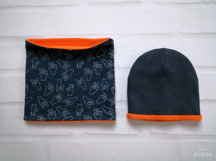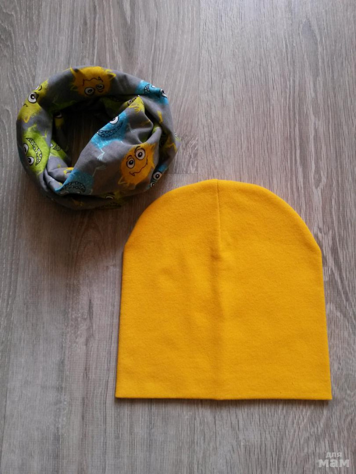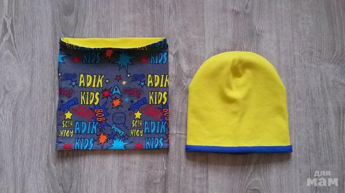 шапочка лимон на синем флисе, снуд на трикотаже