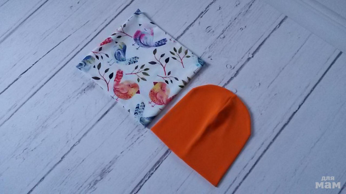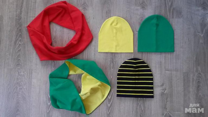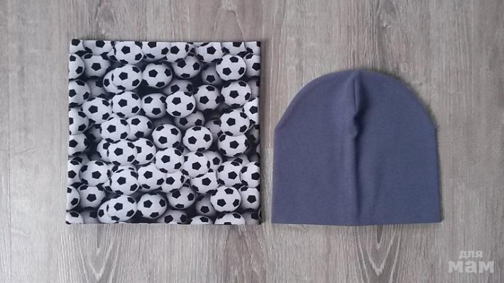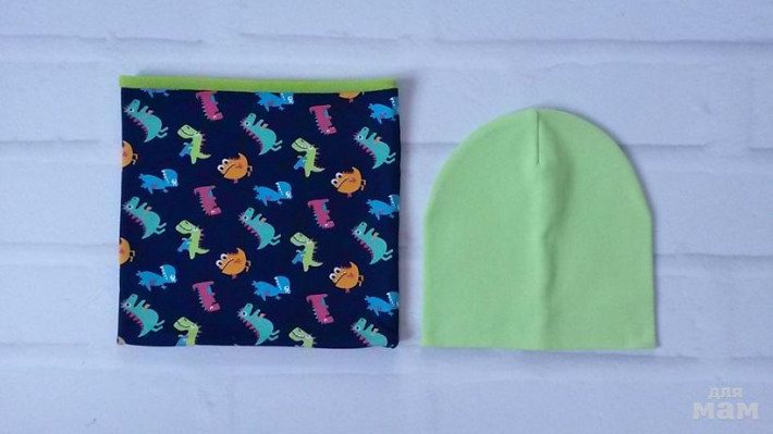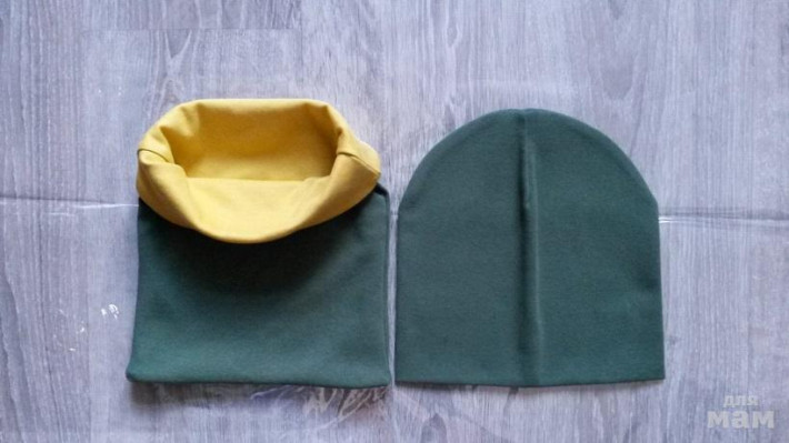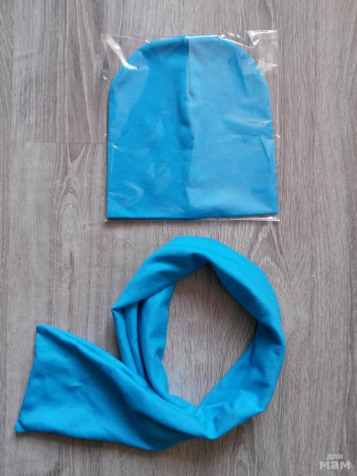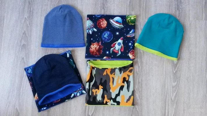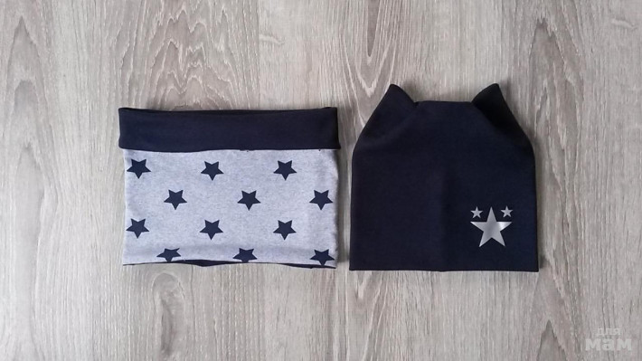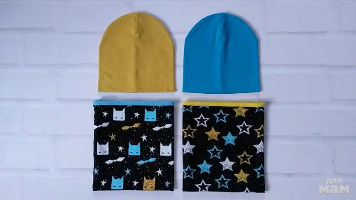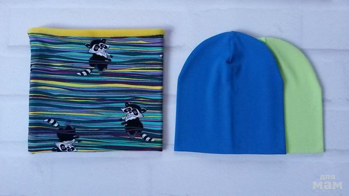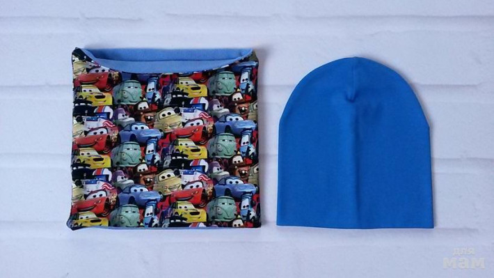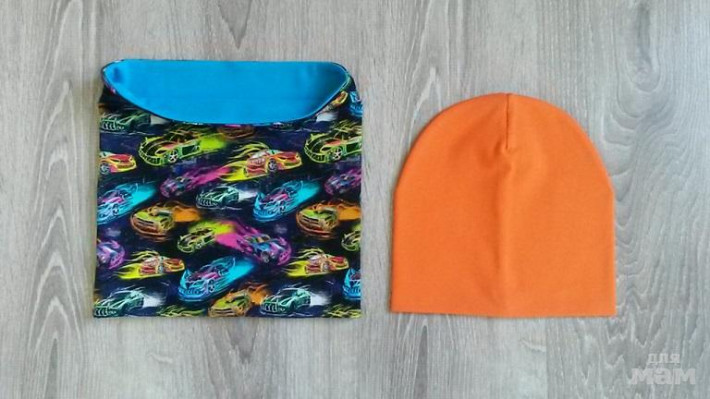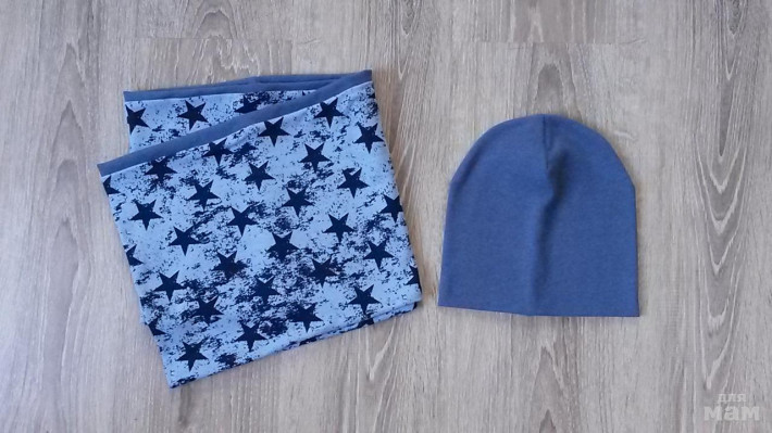 шапочка лимон на синем флисе, снуд на трикотаже