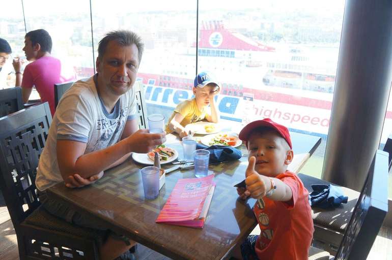И вот отплытие! Восторг и у взрослых, и у детей! Мы плывем! Как здорово! Пошли на ужин в буфет, выбор еды огромный, но, признаться, однообразный. Фруктов много, все свежее, целое, вкусное. Много пиццы итальянской, а вот пасты почти не было совсем или мы не нашли. Старшие дети ели с удовольствием то, что едят и дома - овощи свежие и тушеные, макарошки, картошку, мяско, пиццу. На завтраки - молоко с хлопьями, яичницу. Маленькому Алексею мясо в банках брала из дома, фруктовые пюре и йогурты покупала во Франции.