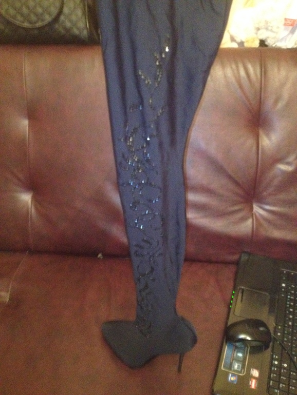 Новые.Сногсшибательные сапоги-чулки, высоченные(почти до попы), шелк, сбоку узор из черных страз. Смотрится потрясающе, секси вещь!. Стоили очень дорого, но мне все-таки великоваты на 38. 9 т.р., разумный торг, обмен на вещи и обувь достойных марок