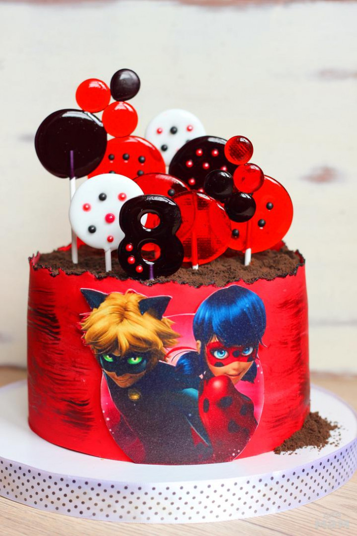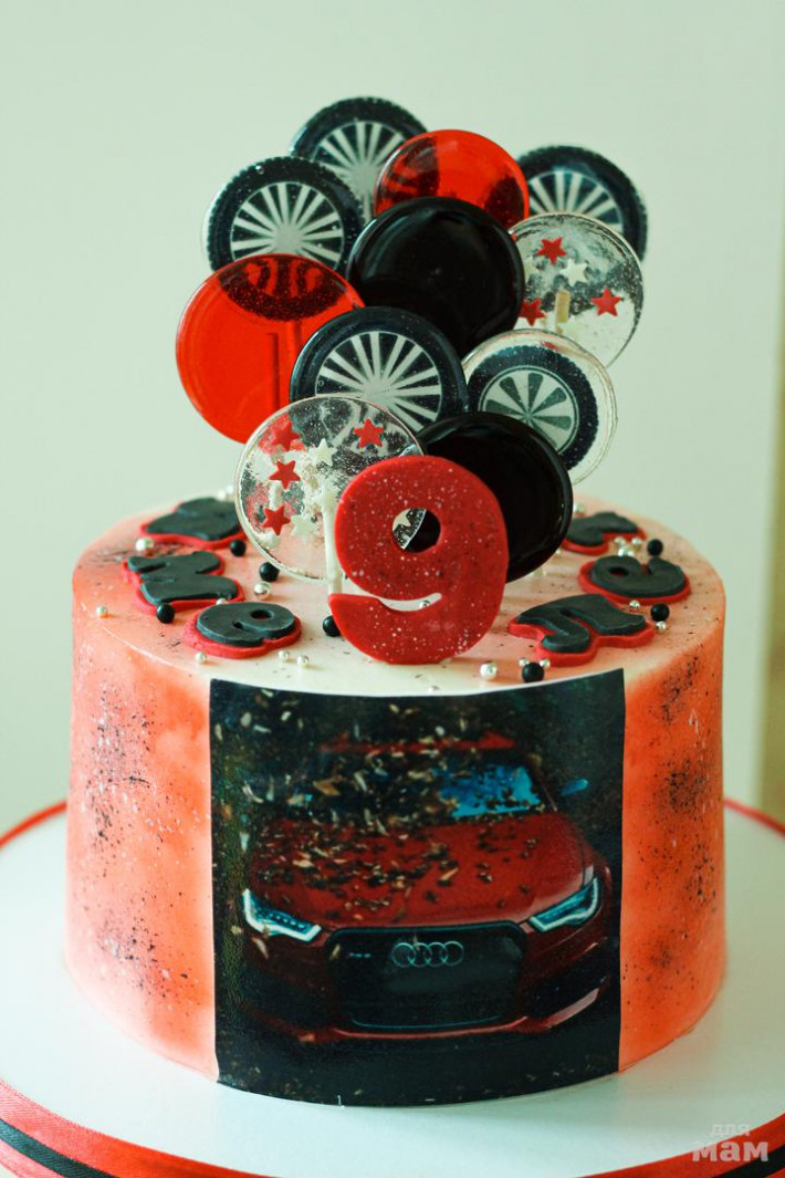 Внутри начинка - «Сникерс». Декор-сахарная картинка, леденцы, цифра и буквы из мастики.Покрытие-крем-чиз.