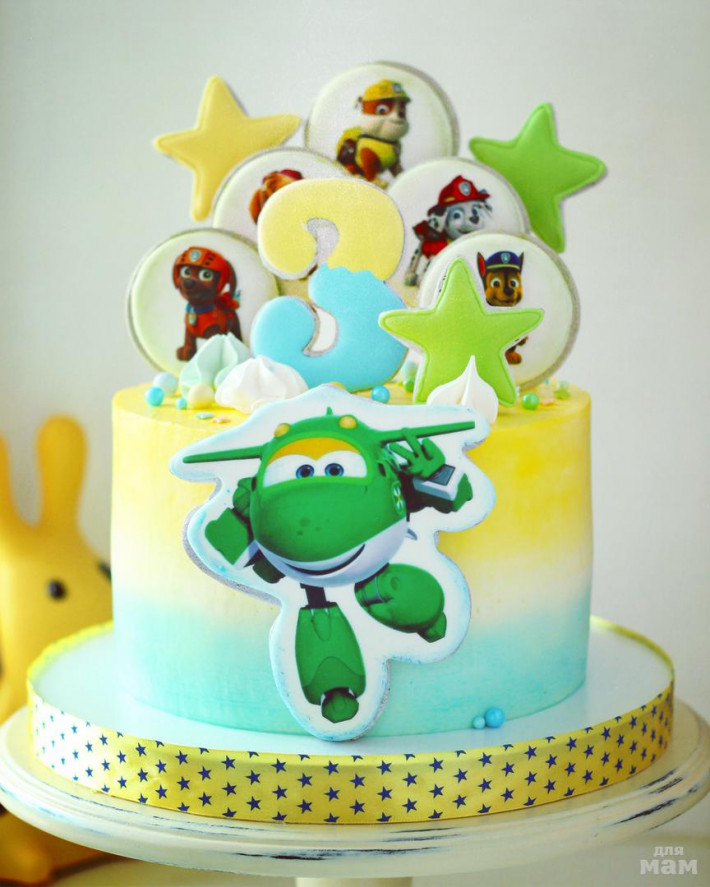 Заказчица попросила сделать героев из 2-х мультиков «Щенячий патруль» и «Суперкрылья». Внутри «Йогуртовый»-ванильные коржи, клубничное конфи, йогуртовый мусс. Декор-пряники. Покрытие-крем-чиз.