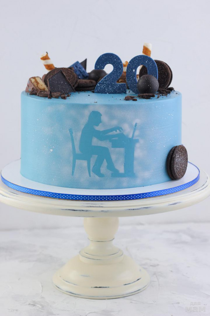 Внутри «Сникерс»(шоколадные коржи, крем-чиз, соленая карамель с арахисом и шоколадный мусс). Покрытие-крем-чиз. Декор-сахарные картинки, шары и звёзды из шоколада.