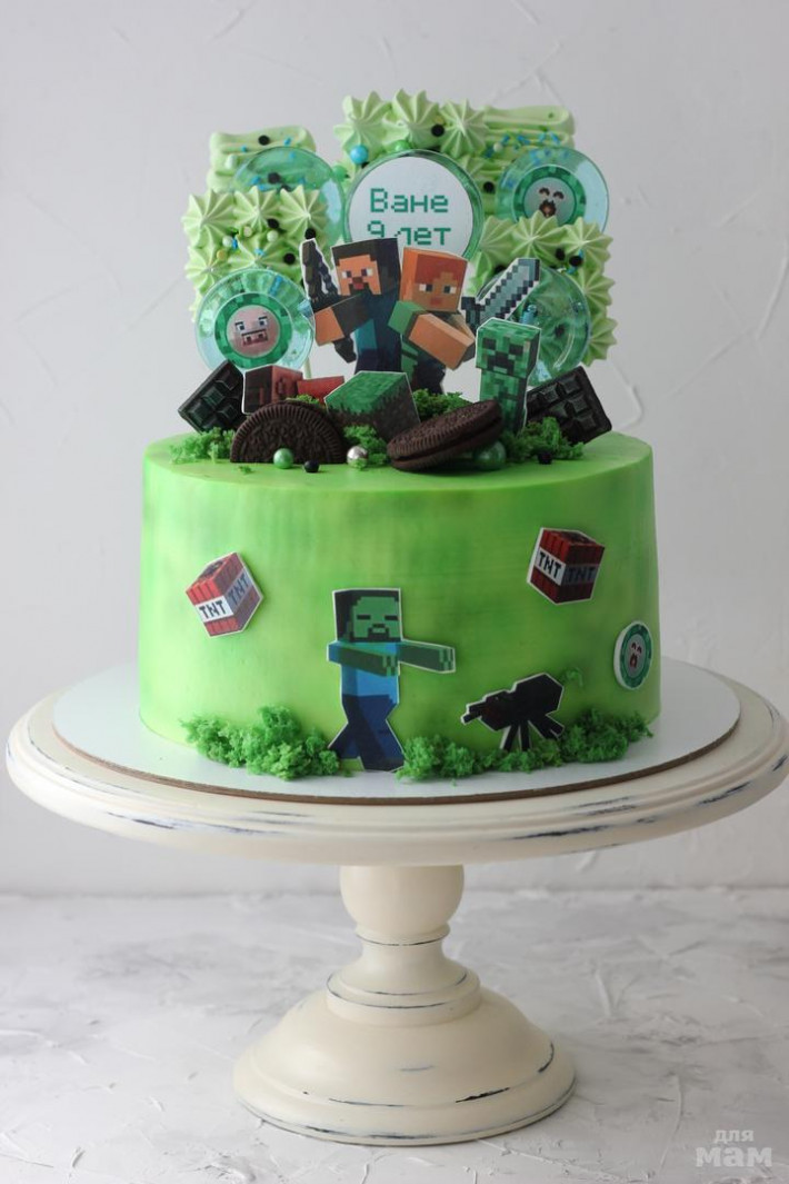 Внутри «малиновый пломбир». Покрытие-крем-чиз. Декор-сахарные картинки, леденцы, шары из шоколада.