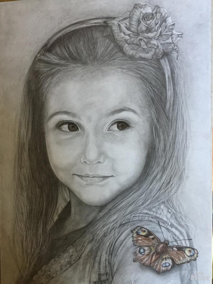 Сюрпризом в портрете послужила бабочка на плече Златы, о ней я не знала и в оригинальной фотографии её было, но она добавила рисунку такой легкости и изюминки, именно присуще такому беззаботному детству, в котором хочется очутиться снова и снова... А ещё, заметила такую особенность, что эта бабочка как будто живая ( незнаю как художник Света достигла такого эффекта), вот-вот она взмахнёт своими блестящими крыльями и улетит...