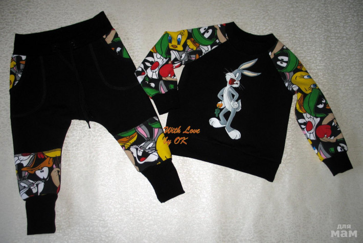 костюм Багз Банни ,размер 92-98, яркий,стильный свитшот с рисунком,выполненным акриловыми красками ,брючки актуального покроя с заниженным шаговым швом(шов между ножек),снабжены боковыми карманами и одним задним кармашком,эластичным широким поясом с дополнительной регулировкой ширины шнурком,широкими манжетами, Косюмчик в единственном экземпляре. ручная работа, новый.1500 руб
