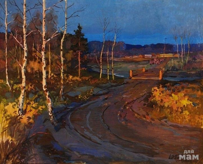 "Осенний вечер", 1940 г. Бумага, темпера. 43,7 х 53,7 см. Титков Иван Васильевич