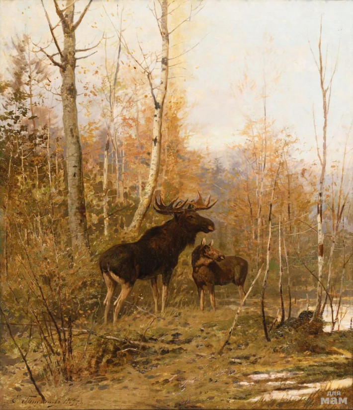 "Лоси в осеннем лесу", 1909 г, Холст, масло. 80,2 х 67,4 см, Тихменев Евгений Александрович