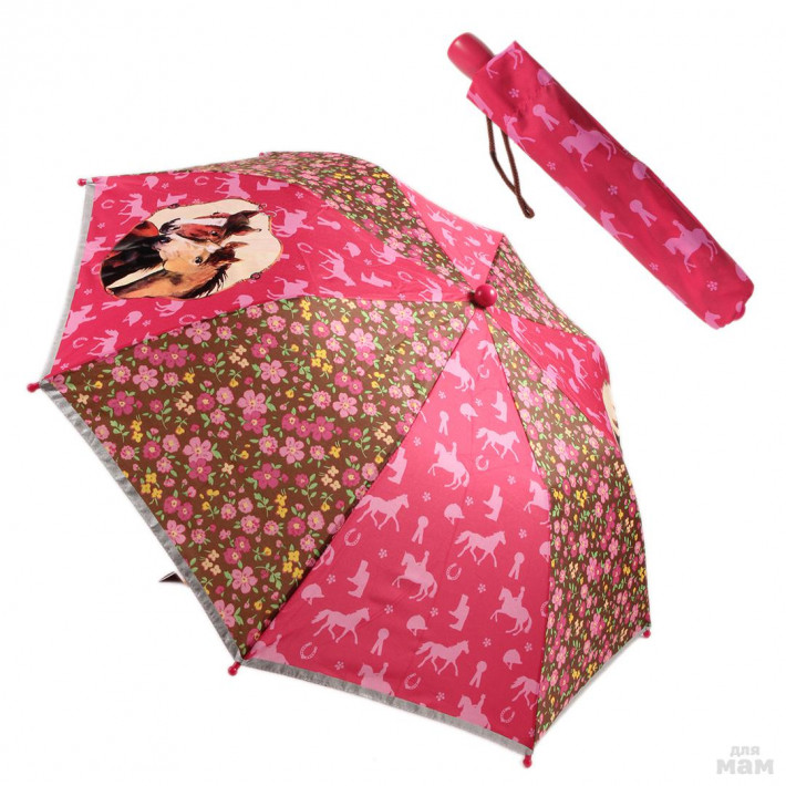 BINO (Чехия)дерево, пластик65 х 65х 66 смЗонтик Pferdefreunde для любительниц лошадей. Легко складывается вручную. В раскрытом виде закроет голову и плечи вашего ребенка. Оснащен светоотражающими полосками по кругу, для большей безопасности ребенка.