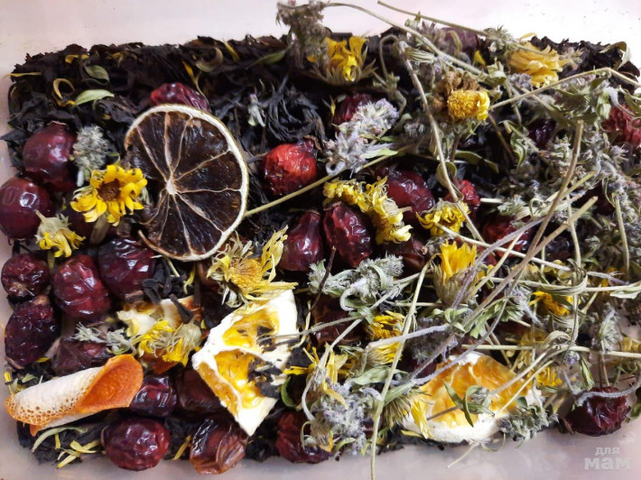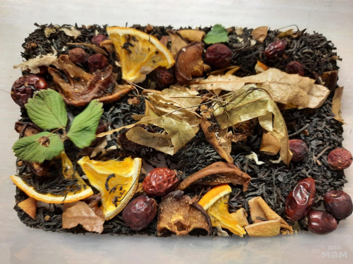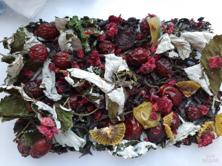 Очень вкусный состав: ягоды малины, листики малины, виноград, киви, калина, шиповник, крупнолистовой чай на выбор. На фото черный.