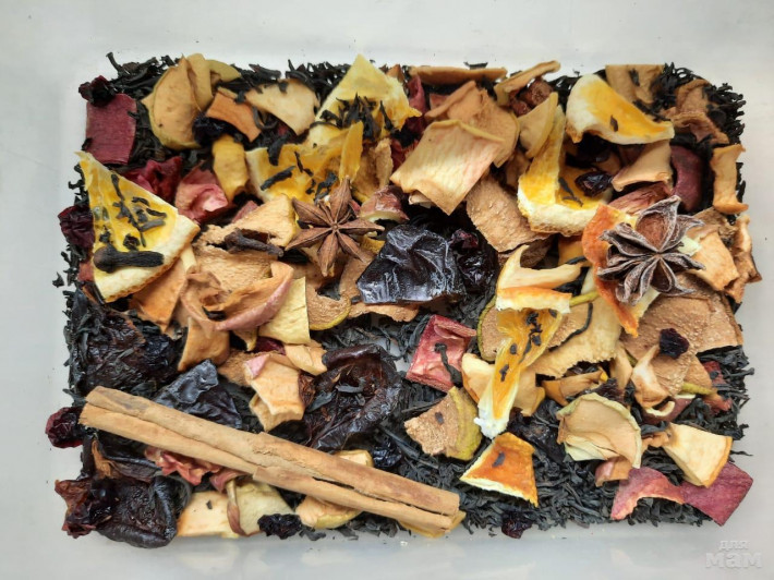 Чай "Рождество". Состав: клюква, айва, яблочко, гранат, слива, апельсин, палочка корицы, бадьян, гвоздика, черный крупнолистовой чай.