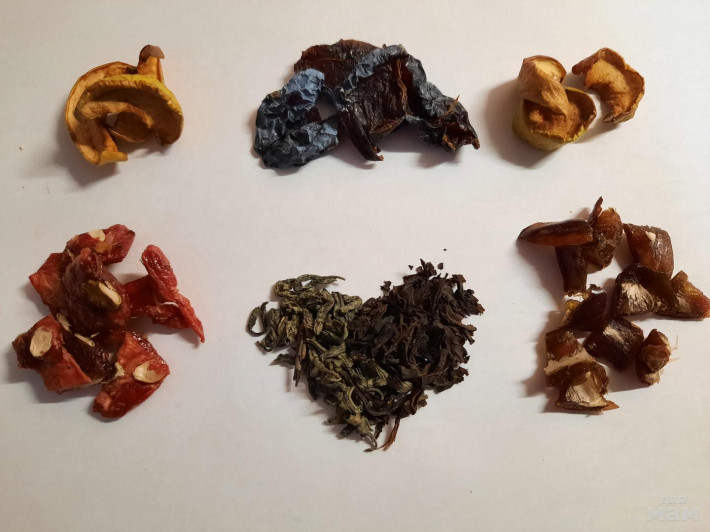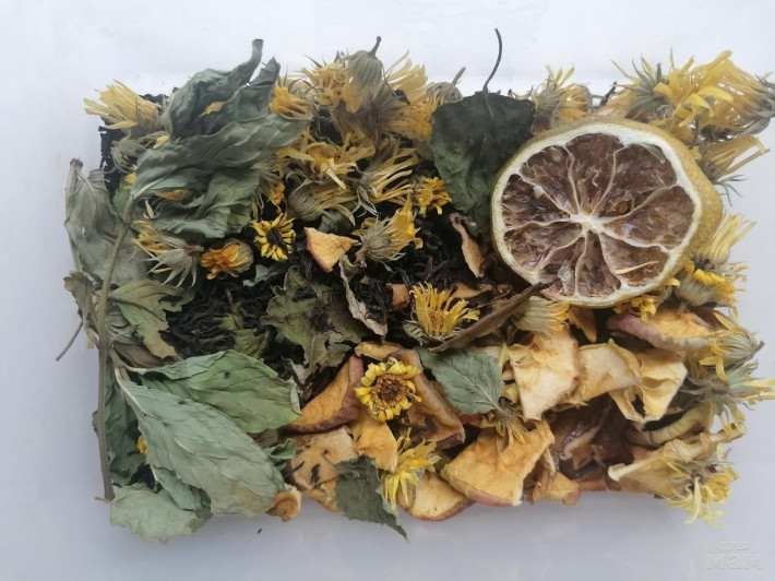 Состав: груша, яблоко, мята, календула, косточки яблочка (источник йода), цитрусовые слайсы, чай на выбор (в готовом черный крупнолистовой) В два остальных не добавляла