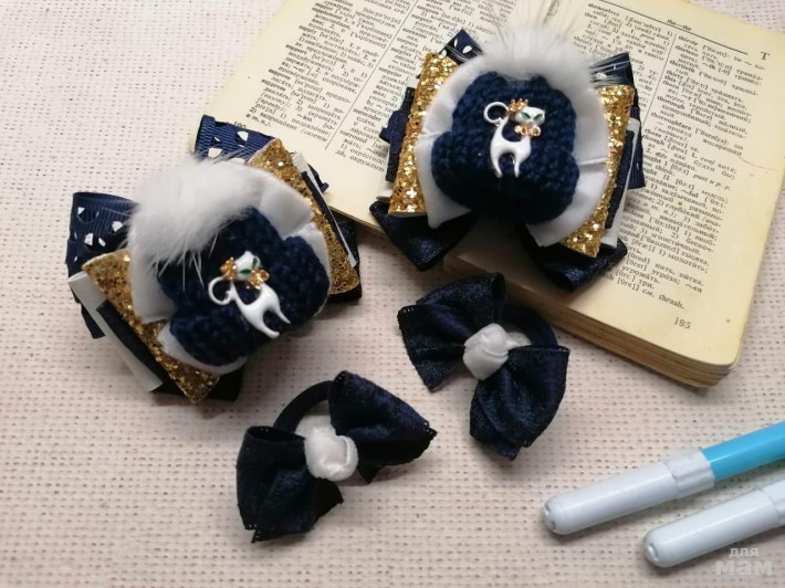 3) Набор из синего бархата. Две пары бантиков на резиночках и бомбические заколки в подарок