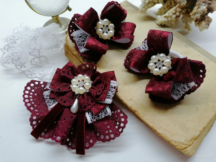 1) Бархат и шифон. Дизайнерская ленточка. Обалденные бантики!) Даже моя, которая нос уже воротит, сказала надо и ей