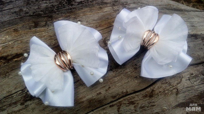 Белые нарядные бантики с красивой органзой и бусинами. Размер 10 см
