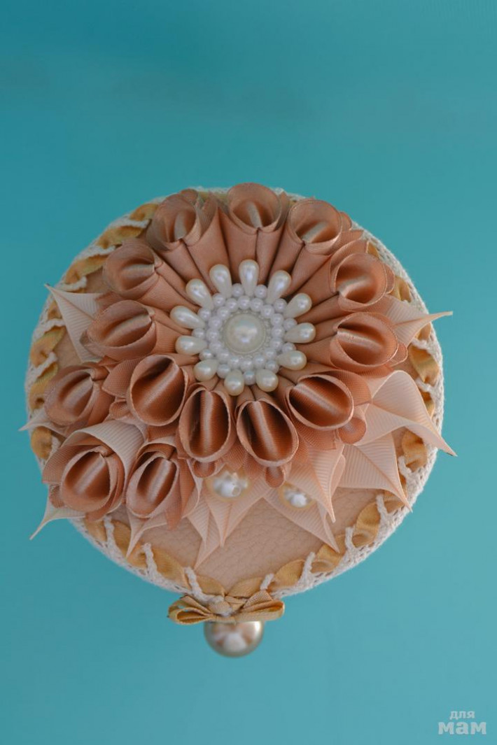 Крышка шкатулки украшена цветами из атласных и репсовых лент, хлопковым кружевом, бусинами.