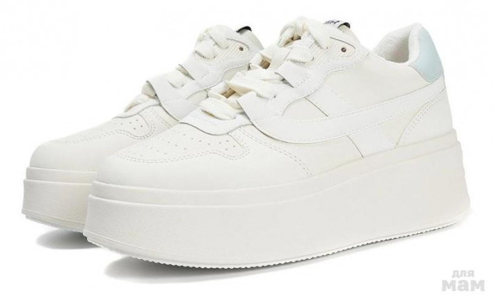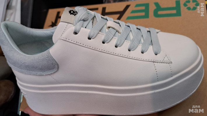 Кеды на массивной подошве из эко-линейки BE KIND выполнены из натуральной белой кожи, изготовленной без использования металла. Задник украшен вышивкой голубого цвета в виде цветка-логотипа линейки. Завершает силуэт двухслойная платформа белого цвета с логотипом бренда на задней части.