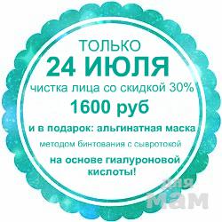 Только в понедельник, 24 июля, чистка лица с скидкой 30% и ещё в подарочек альгинатная маска, наложение методом бинтования, а под ней, увлажняющая сыворотка на основе гиалуроновой кислоты!