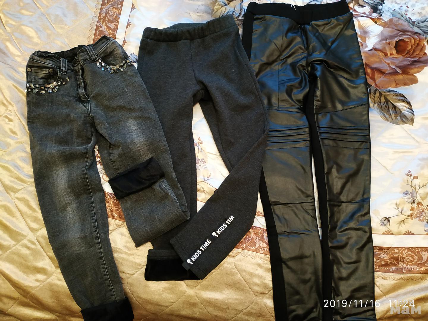 Брючки в школу, джинсы р.130 всё с утеплителем, брючки спереди под кожу, ткань такой фактуры, тоже с утеплителем, великоваты пока р.140, но я люблю запасы)))