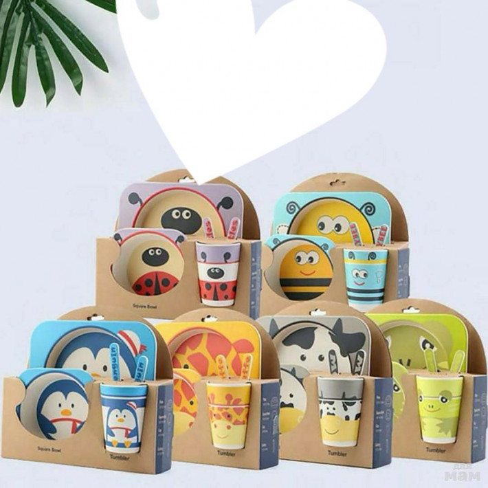 Детская посуда из бамбука. Набор состоит из 5 предметов: -большая тарелочка с двумя отделениями -маленькая тарелочка -стаканчик -вилка -ложка Такой набор обязательно заинтересует вашего малыша и процесс кормления станет в разы проще.