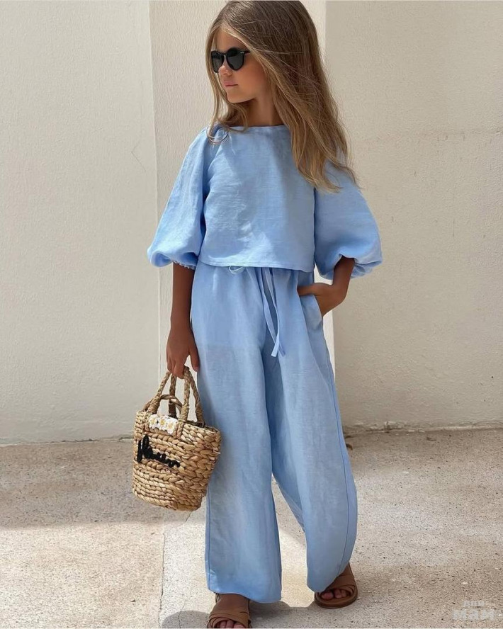 Этот летний нарядный костюм для девочки подростка точно порадует вашего ребенка. В него входят яркие штаны с удобной посадкой, а также стильная рубашка на завязках с коротким рукавом.